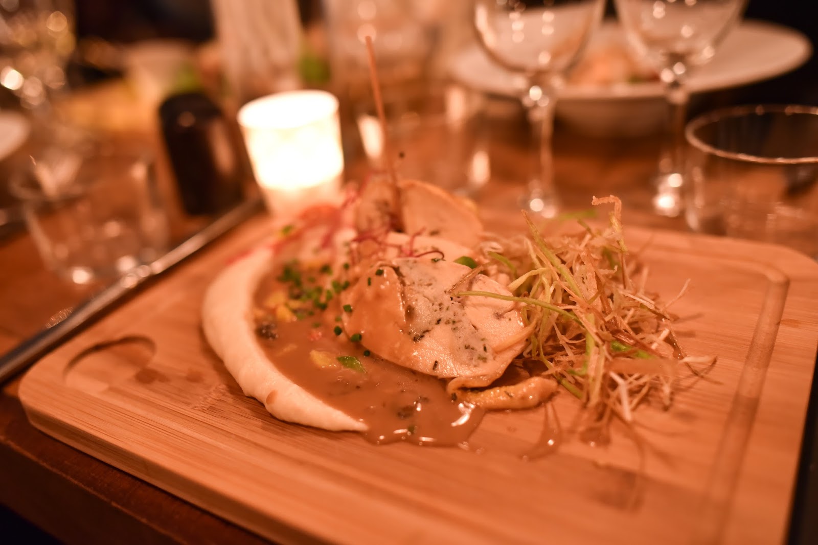 | Suprême de volaille farçi aux herbes, crème de pesto aux morilles, mousseline de panais, julienne de poireaux. |